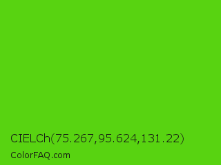 CIELCh 75.267,95.624,131.22 Color is a normal green color and the nearest color is Harlequin Green #46cb18. Hex code #58d311 and RGB value is rgb(88,211,17). In RGB color space, this color is composed of 35% red, 83% green, 7% blue, In CMYK color space, this color is composed of 58% cyan, 0% magenta, 92% yellow , 17% black , In HSL color space, this color has a hue angle of 98° , 85% saturation and 45% lightness.