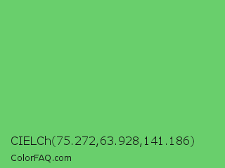CIELCh 75.272,63.928,141.186 Color is a light green color and the nearest color is Mantis #74c365. Hex code #69cf6c and RGB value is rgb(105,207,108). In RGB color space, this color is composed of 41% red, 81% green, 42% blue, In CMYK color space, this color is composed of 49% cyan, 0% magenta, 48% yellow , 19% black , In HSL color space, this color has a hue angle of 122° , 52% saturation and 61% lightness.