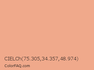 CIELCh 75.305,34.357,48.974 Color is a light orange color and the nearest color is Tonys Pink #e79f8c. Hex code #f0a98b and RGB value is rgb(240,169,139). In RGB color space, this color is composed of 94% red, 66% green, 55% blue, In CMYK color space, this color is composed of 0% cyan, 30% magenta, 42% yellow , 6% black , In HSL color space, this color has a hue angle of 18° , 77% saturation and 74% lightness.