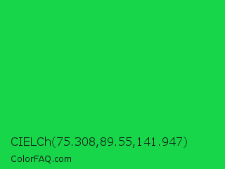 CIELCh 75.308,89.55,141.947 Color is a normal green color and the nearest color is Malachite #0bda51. Hex code #17d64a and RGB value is rgb(23,214,74). In RGB color space, this color is composed of 9% red, 84% green, 29% blue, In CMYK color space, this color is composed of 89% cyan, 0% magenta, 65% yellow , 16% black , In HSL color space, this color has a hue angle of 136° , 81% saturation and 46% lightness.