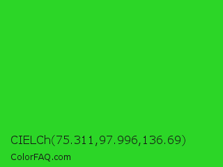 CIELCh 75.311,97.996,136.69 Color is a normal green color and the nearest color is Lime Green #32cd32. Hex code #2cd627 and RGB value is rgb(44,214,39). In RGB color space, this color is composed of 17% red, 84% green, 15% blue, In CMYK color space, this color is composed of 79% cyan, 0% magenta, 82% yellow , 16% black , In HSL color space, this color has a hue angle of 118° , 69% saturation and 50% lightness.