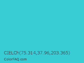 CIELCh 75.314,37.96,203.365 Color is a normal cyan color and the nearest color is Scooter #2ebfd4. Hex code #38ccd4 and RGB value is rgb(56,204,212). In RGB color space, this color is composed of 22% red, 80% green, 83% blue, In CMYK color space, this color is composed of 74% cyan, 4% magenta, 0% yellow , 17% black , In HSL color space, this color has a hue angle of 183° , 64% saturation and 53% lightness.