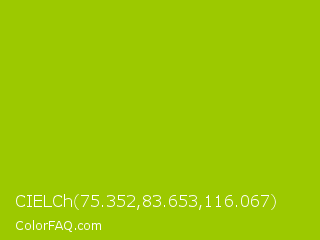 CIELCh 75.352,83.653,116.067 Color is a normal lime color and the nearest color is Pistachio Green #9dc209. Hex code #9cc900 and RGB value is rgb(156,201,0). In RGB color space, this color is composed of 61% red, 79% green, 0% blue, In CMYK color space, this color is composed of 22% cyan, 0% magenta, 100% yellow , 21% black , In HSL color space, this color has a hue angle of 73° , 100% saturation and 39% lightness.