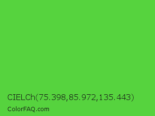 CIELCh 75.398,85.972,135.443 Color is a normal green color and the nearest color is Lime Green #32cd32. Hex code #56d33e and RGB value is rgb(86,211,62). In RGB color space, this color is composed of 34% red, 83% green, 24% blue, In CMYK color space, this color is composed of 59% cyan, 0% magenta, 71% yellow , 17% black , In HSL color space, this color has a hue angle of 110° , 63% saturation and 54% lightness.