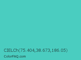 CIELCh 75.404,38.673,186.05 Color is a normal cyan color and the nearest color is Medium Turquoise #48d1cc. Hex code #4acdc0 and RGB value is rgb(74,205,192). In RGB color space, this color is composed of 29% red, 80% green, 75% blue, In CMYK color space, this color is composed of 64% cyan, 0% magenta, 6% yellow , 20% black , In HSL color space, this color has a hue angle of 174° , 57% saturation and 55% lightness.
