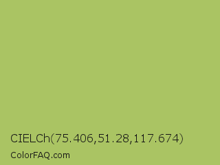 CIELCh 75.406,51.28,117.674 Color is a normal lime color and the nearest color is Middle Green Yellow #acbf60. Hex code #aac463 and RGB value is rgb(170,196,99). In RGB color space, this color is composed of 67% red, 77% green, 39% blue, In CMYK color space, this color is composed of 13% cyan, 0% magenta, 49% yellow , 23% black , In HSL color space, this color has a hue angle of 76° , 45% saturation and 58% lightness.