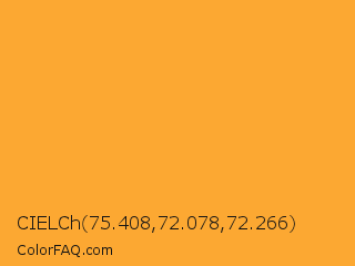 CIELCh 75.408,72.078,72.266 Color is a normal orange color and the nearest color is Sea Buckthorn #fba129. Hex code #fca832 and RGB value is rgb(252,168,50). In RGB color space, this color is composed of 99% red, 66% green, 20% blue, In CMYK color space, this color is composed of 0% cyan, 33% magenta, 80% yellow , 1% black , In HSL color space, this color has a hue angle of 35° , 97% saturation and 59% lightness.