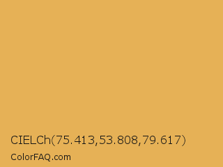 CIELCh 75.413,53.808,79.617 Color is a light orange color and the nearest color is Sunray #e3ab57. Hex code #e6b156 and RGB value is rgb(230,177,86). In RGB color space, this color is composed of 90% red, 69% green, 34% blue, In CMYK color space, this color is composed of 0% cyan, 23% magenta, 63% yellow , 10% black , In HSL color space, this color has a hue angle of 38° , 74% saturation and 62% lightness.