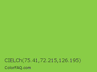 CIELCh 75.41,72.215,126.195 Color is a normal green color and the nearest color is Yellow Green #9acd32. Hex code #89cc45 and RGB value is rgb(137,204,69). In RGB color space, this color is composed of 54% red, 80% green, 27% blue, In CMYK color space, this color is composed of 33% cyan, 0% magenta, 66% yellow , 20% black , In HSL color space, this color has a hue angle of 90° , 57% saturation and 54% lightness.