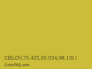 CIELCh 75.425,65.034,98.131 Color is a normal yellow color and the nearest color is Earls Green #c9b93b. Hex code #cbbc39 and RGB value is rgb(203,188,57). In RGB color space, this color is composed of 80% red, 74% green, 22% blue, In CMYK color space, this color is composed of 0% cyan, 7% magenta, 72% yellow , 20% black , In HSL color space, this color has a hue angle of 54° , 58% saturation and 51% lightness.