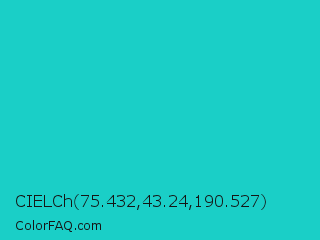 CIELCh 75.432,43.24,190.527 Color is a normal cyan color and the nearest color is Java #1fc2c2. Hex code #1acfc7 and RGB value is rgb(26,207,199). In RGB color space, this color is composed of 10% red, 81% green, 78% blue, In CMYK color space, this color is composed of 87% cyan, 0% magenta, 4% yellow , 19% black , In HSL color space, this color has a hue angle of 177° , 78% saturation and 46% lightness.