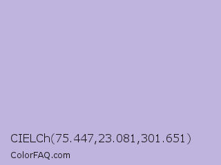 CIELCh 75.447,23.081,301.651 Color is a light indigo color and the nearest color is Lavender Gray #bdbbd7. Hex code #bfb4de and RGB value is rgb(191,180,222). In RGB color space, this color is composed of 75% red, 71% green, 87% blue, In CMYK color space, this color is composed of 14% cyan, 19% magenta, 0% yellow , 13% black , In HSL color space, this color has a hue angle of 256° , 39% saturation and 79% lightness.