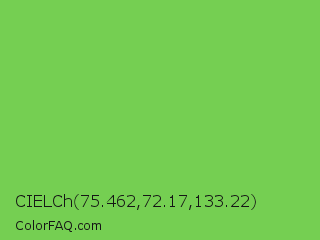 CIELCh 75.462,72.17,133.22 Color is a normal green color and the nearest color is Mantis #74c365. Hex code #75cf52 and RGB value is rgb(117,207,82). In RGB color space, this color is composed of 46% red, 81% green, 32% blue, In CMYK color space, this color is composed of 43% cyan, 0% magenta, 60% yellow , 19% black , In HSL color space, this color has a hue angle of 103° , 57% saturation and 57% lightness.
