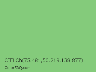 CIELCh 75.481,50.219,138.877 Color is a light green color and the nearest color is De York #7ac488. Hex code #84cb7b and RGB value is rgb(132,203,123). In RGB color space, this color is composed of 52% red, 80% green, 48% blue, In CMYK color space, this color is composed of 35% cyan, 0% magenta, 39% yellow , 20% black , In HSL color space, this color has a hue angle of 113° , 43% saturation and 64% lightness.