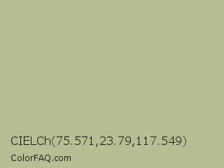 CIELCh 75.571,23.79,117.549 Color is a light lime color and the nearest color is Swamp Green #acb78e. Hex code #b5bf93 and RGB value is rgb(181,191,147). In RGB color space, this color is composed of 71% red, 75% green, 58% blue, In CMYK color space, this color is composed of 5% cyan, 0% magenta, 23% yellow , 25% black , In HSL color space, this color has a hue angle of 74° , 26% saturation and 66% lightness.