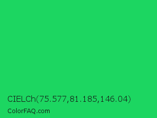 CIELCh 75.577,81.185,146.04 Color is a normal green color and the nearest color is Malachite #0bda51. Hex code #1cd661 and RGB value is rgb(28,214,97). In RGB color space, this color is composed of 11% red, 84% green, 38% blue, In CMYK color space, this color is composed of 87% cyan, 0% magenta, 55% yellow , 16% black , In HSL color space, this color has a hue angle of 142° , 77% saturation and 47% lightness.