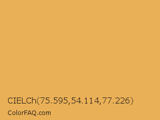 CIELCh 75.595,54.114,77.226 Color is a light orange color and the nearest color is Sunray #e3ab57. Hex code #eab057 and RGB value is rgb(234,176,87). In RGB color space, this color is composed of 92% red, 69% green, 34% blue, In CMYK color space, this color is composed of 0% cyan, 25% magenta, 63% yellow , 8% black , In HSL color space, this color has a hue angle of 36° , 78% saturation and 63% lightness.