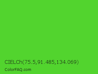CIELCh 75.5,91.485,134.069 Color is a normal green color and the nearest color is Harlequin Green #46cb18. Hex code #52d42e and RGB value is rgb(82,212,46). In RGB color space, this color is composed of 32% red, 83% green, 18% blue, In CMYK color space, this color is composed of 61% cyan, 0% magenta, 78% yellow , 17% black , In HSL color space, this color has a hue angle of 107° , 66% saturation and 51% lightness.