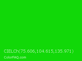CIELCh 75.606,104.615,135.971 Color is a normal green color and the nearest color is Green #00ff00. Hex code #11d808 and RGB value is rgb(17,216,8). In RGB color space, this color is composed of 7% red, 85% green, 3% blue, In CMYK color space, this color is composed of 92% cyan, 0% magenta, 96% yellow , 15% black , In HSL color space, this color has a hue angle of 117° , 93% saturation and 44% lightness.