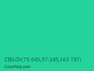 CIELCh 75.645,57.245,163.737 Color is a normal green color and the nearest color is Shamrock #33cc99. Hex code #23d39b and RGB value is rgb(35,211,155). In RGB color space, this color is composed of 14% red, 83% green, 61% blue, In CMYK color space, this color is composed of 83% cyan, 0% magenta, 27% yellow , 17% black , In HSL color space, this color has a hue angle of 161° , 72% saturation and 48% lightness.