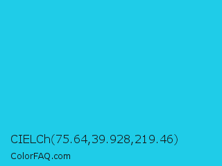 CIELCh 75.64,39.928,219.46 Color is a normal cyan color and the nearest color is Scooter #2ebfd4. Hex code #1fcce8 and RGB value is rgb(31,204,232). In RGB color space, this color is composed of 12% red, 80% green, 91% blue, In CMYK color space, this color is composed of 87% cyan, 12% magenta, 0% yellow , 9% black , In HSL color space, this color has a hue angle of 188° , 81% saturation and 52% lightness.