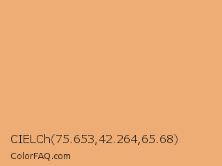 CIELCh 75.653,42.264,65.68 Color is a light orange color and the nearest color is Middle Yellow Red #ecb176. Hex code #eead74 and RGB value is rgb(238,173,116). In RGB color space, this color is composed of 93% red, 68% green, 45% blue, In CMYK color space, this color is composed of 0% cyan, 27% magenta, 51% yellow , 7% black , In HSL color space, this color has a hue angle of 28° , 78% saturation and 69% lightness.