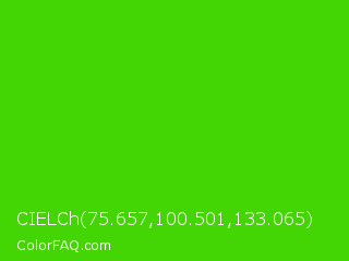 CIELCh 75.657,100.501,133.065 Color is a normal green color and the nearest color is Harlequin Green #46cb18. Hex code #44d604 and RGB value is rgb(68,214,4). In RGB color space, this color is composed of 27% red, 84% green, 2% blue, In CMYK color space, this color is composed of 68% cyan, 0% magenta, 98% yellow , 16% black , In HSL color space, this color has a hue angle of 102° , 96% saturation and 43% lightness.