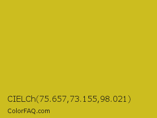 CIELCh 75.657,73.155,98.021 Color is a normal yellow color and the nearest color is Key Lime Pie #bfc921. Hex code #ccbd1f and RGB value is rgb(204,189,31). In RGB color space, this color is composed of 80% red, 74% green, 12% blue, In CMYK color space, this color is composed of 0% cyan, 7% magenta, 85% yellow , 20% black , In HSL color space, this color has a hue angle of 55° , 74% saturation and 46% lightness.