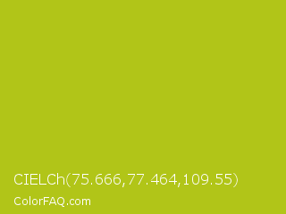 CIELCh 75.666,77.464,109.55 Color is a normal yellow color and the nearest color is Acid Green #b0bf1a. Hex code #b1c518 and RGB value is rgb(177,197,24). In RGB color space, this color is composed of 69% red, 77% green, 9% blue, In CMYK color space, this color is composed of 10% cyan, 0% magenta, 88% yellow , 23% black , In HSL color space, this color has a hue angle of 67° , 78% saturation and 43% lightness.