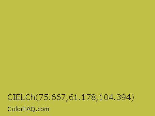 CIELCh 75.667,61.178,104.394 Color is a normal yellow color and the nearest color is Turmeric #cabb48. Hex code #c0c046 and RGB value is rgb(192,192,70). In RGB color space, this color is composed of 75% red, 75% green, 27% blue, In CMYK color space, this color is composed of 0% cyan, 0% magenta, 64% yellow , 25% black , In HSL color space, this color has a hue angle of 60° , 49% saturation and 51% lightness.
