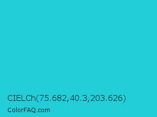 CIELCh 75.682,40.3,203.626 Color is a normal cyan color and the nearest color is Scooter #2ebfd4. Hex code #21ced7 and RGB value is rgb(33,206,215). In RGB color space, this color is composed of 13% red, 81% green, 84% blue, In CMYK color space, this color is composed of 85% cyan, 4% magenta, 0% yellow , 16% black , In HSL color space, this color has a hue angle of 183° , 73% saturation and 49% lightness.