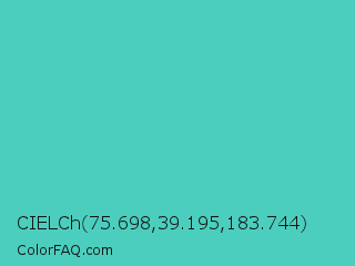 CIELCh 75.698,39.195,183.744 Color is a normal cyan color and the nearest color is Medium Turquoise #48d1cc. Hex code #4ccebe and RGB value is rgb(76,206,190). In RGB color space, this color is composed of 30% red, 81% green, 75% blue, In CMYK color space, this color is composed of 63% cyan, 0% magenta, 8% yellow , 19% black , In HSL color space, this color has a hue angle of 173° , 57% saturation and 55% lightness.
