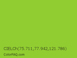 CIELCh 75.711,77.942,121.786 Color is a normal green color and the nearest color is Atlantis #97cd2d. Hex code #91cc30 and RGB value is rgb(145,204,48). In RGB color space, this color is composed of 57% red, 80% green, 19% blue, In CMYK color space, this color is composed of 29% cyan, 0% magenta, 76% yellow , 20% black , In HSL color space, this color has a hue angle of 83° , 62% saturation and 49% lightness.