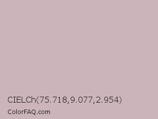 CIELCh 75.718,9.077,2.954 Color is a light red color and the nearest color is Cold Turkey #cebaba. Hex code #ccb5ba and RGB value is rgb(204,181,186). In RGB color space, this color is composed of 80% red, 71% green, 73% blue, In CMYK color space, this color is composed of 0% cyan, 11% magenta, 9% yellow , 20% black , In HSL color space, this color has a hue angle of 347° , 18% saturation and 75% lightness.