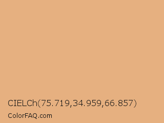 CIELCh 75.719,34.959,66.857 Color is a light orange color and the nearest color is Tacao #edb381. Hex code #e6b080 and RGB value is rgb(230,176,128). In RGB color space, this color is composed of 90% red, 69% green, 50% blue, In CMYK color space, this color is composed of 0% cyan, 23% magenta, 44% yellow , 10% black , In HSL color space, this color has a hue angle of 28° , 67% saturation and 70% lightness.