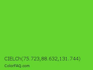 CIELCh 75.723,88.632,131.744 Color is a normal green color and the nearest color is Green RYB #66b032. Hex code #63d32e and RGB value is rgb(99,211,46). In RGB color space, this color is composed of 39% red, 83% green, 18% blue, In CMYK color space, this color is composed of 53% cyan, 0% magenta, 78% yellow , 17% black , In HSL color space, this color has a hue angle of 101° , 65% saturation and 50% lightness.