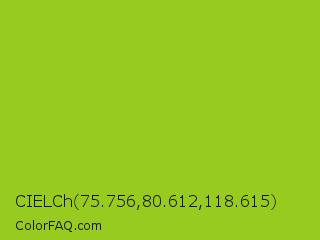 CIELCh 75.756,80.612,118.615 Color is a normal lime color and the nearest color is Atlantis #97cd2d. Hex code #98cb20 and RGB value is rgb(152,203,32). In RGB color space, this color is composed of 60% red, 80% green, 13% blue, In CMYK color space, this color is composed of 25% cyan, 0% magenta, 84% yellow , 20% black , In HSL color space, this color has a hue angle of 78° , 73% saturation and 46% lightness.
