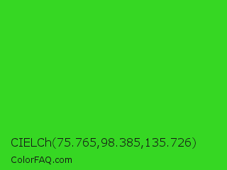 CIELCh 75.765,98.385,135.726 Color is a normal green color and the nearest color is Lime Green #32cd32. Hex code #36d723 and RGB value is rgb(54,215,35). In RGB color space, this color is composed of 21% red, 84% green, 14% blue, In CMYK color space, this color is composed of 75% cyan, 0% magenta, 84% yellow , 16% black , In HSL color space, this color has a hue angle of 114° , 72% saturation and 49% lightness.