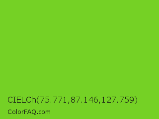 CIELCh 75.771,87.146,127.759 Color is a normal green color and the nearest color is Lima #76bd17. Hex code #75d125 and RGB value is rgb(117,209,37). In RGB color space, this color is composed of 46% red, 82% green, 15% blue, In CMYK color space, this color is composed of 44% cyan, 0% magenta, 82% yellow , 18% black , In HSL color space, this color has a hue angle of 92° , 70% saturation and 48% lightness.