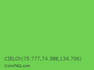 CIELCh 75.777,74.388,134.706 Color is a normal green color and the nearest color is Mantis #74c365. Hex code #6ed152 and RGB value is rgb(110,209,82). In RGB color space, this color is composed of 43% red, 82% green, 32% blue, In CMYK color space, this color is composed of 47% cyan, 0% magenta, 61% yellow , 18% black , In HSL color space, this color has a hue angle of 107° , 58% saturation and 57% lightness.