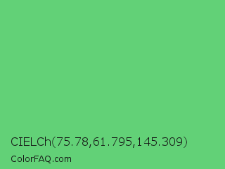CIELCh 75.78,61.795,145.309 Color is a normal green color and the nearest color is Emerald #50c878. Hex code #62d177 and RGB value is rgb(98,209,119). In RGB color space, this color is composed of 38% red, 82% green, 47% blue, In CMYK color space, this color is composed of 53% cyan, 0% magenta, 43% yellow , 18% black , In HSL color space, this color has a hue angle of 131° , 55% saturation and 60% lightness.