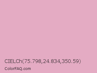 CIELCh 75.798,24.834,350.59 Color is a light rose color and the nearest color is Pink Pearl #e7accf. Hex code #e4abc3 and RGB value is rgb(228,171,195). In RGB color space, this color is composed of 89% red, 67% green, 76% blue, In CMYK color space, this color is composed of 0% cyan, 25% magenta, 14% yellow , 11% black , In HSL color space, this color has a hue angle of 335° , 51% saturation and 78% lightness.