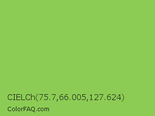 CIELCh 75.7,66.005,127.624 Color is a normal green color and the nearest color is Dollar Bill #85bb65. Hex code #8ccc54 and RGB value is rgb(140,204,84). In RGB color space, this color is composed of 55% red, 80% green, 33% blue, In CMYK color space, this color is composed of 31% cyan, 0% magenta, 59% yellow , 20% black , In HSL color space, this color has a hue angle of 92° , 54% saturation and 56% lightness.