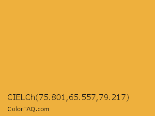 CIELCh 75.801,65.557,79.217 Color is a normal orange color and the nearest color is Tulip Tree #eab33b. Hex code #eeb03d and RGB value is rgb(238,176,61). In RGB color space, this color is composed of 93% red, 69% green, 24% blue, In CMYK color space, this color is composed of 0% cyan, 26% magenta, 74% yellow , 7% black , In HSL color space, this color has a hue angle of 39° , 84% saturation and 59% lightness.