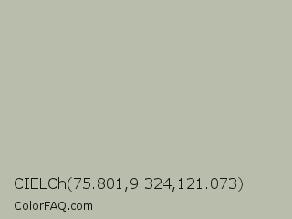 CIELCh 75.801,9.324,121.073 Color is a light lime color and the nearest color is Green Spring #b8c1b1. Hex code #b8bdac and RGB value is rgb(184,189,172). In RGB color space, this color is composed of 72% red, 74% green, 67% blue, In CMYK color space, this color is composed of 3% cyan, 0% magenta, 9% yellow , 26% black , In HSL color space, this color has a hue angle of 78° , 11% saturation and 71% lightness.