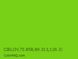 CIELCh 75.858,89.313,126.3 Color is a normal green color and the nearest color is Lima #76bd17. Hex code #78d117 and RGB value is rgb(120,209,23). In RGB color space, this color is composed of 47% red, 82% green, 9% blue, In CMYK color space, this color is composed of 43% cyan, 0% magenta, 89% yellow , 18% black , In HSL color space, this color has a hue angle of 89° , 80% saturation and 45% lightness.