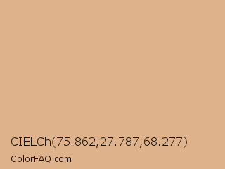 CIELCh 75.862,27.787,68.277 Color is a light orange color and the nearest color is Burlywood #deb887. Hex code #deb38c and RGB value is rgb(222,179,140). In RGB color space, this color is composed of 87% red, 70% green, 55% blue, In CMYK color space, this color is composed of 0% cyan, 19% magenta, 37% yellow , 13% black , In HSL color space, this color has a hue angle of 29° , 55% saturation and 71% lightness.