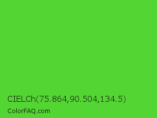 CIELCh 75.864,90.504,134.5 Color is a normal green color and the nearest color is Harlequin Green #46cb18. Hex code #53d533 and RGB value is rgb(83,213,51). In RGB color space, this color is composed of 33% red, 84% green, 20% blue, In CMYK color space, this color is composed of 61% cyan, 0% magenta, 76% yellow , 16% black , In HSL color space, this color has a hue angle of 108° , 66% saturation and 52% lightness.