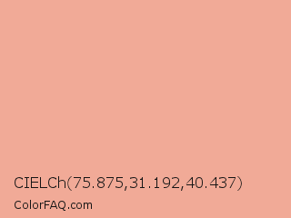 CIELCh 75.875,31.192,40.437 Color is a light red color and the nearest color is Mona Lisa #ffa194. Hex code #f1aa97 and RGB value is rgb(241,170,151). In RGB color space, this color is composed of 95% red, 67% green, 59% blue, In CMYK color space, this color is composed of 0% cyan, 29% magenta, 37% yellow , 5% black , In HSL color space, this color has a hue angle of 13° , 76% saturation and 77% lightness.