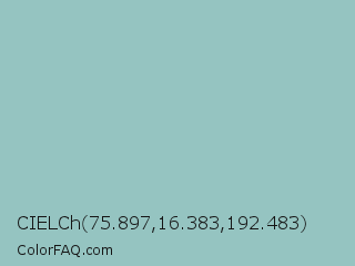 CIELCh 75.897,16.383,192.483 Color is a light cyan color and the nearest color is Shadow Green #9ac2b8. Hex code #95c4c1 and RGB value is rgb(149,196,193). In RGB color space, this color is composed of 58% red, 77% green, 76% blue, In CMYK color space, this color is composed of 24% cyan, 0% magenta, 2% yellow , 23% black , In HSL color space, this color has a hue angle of 176° , 28% saturation and 68% lightness.